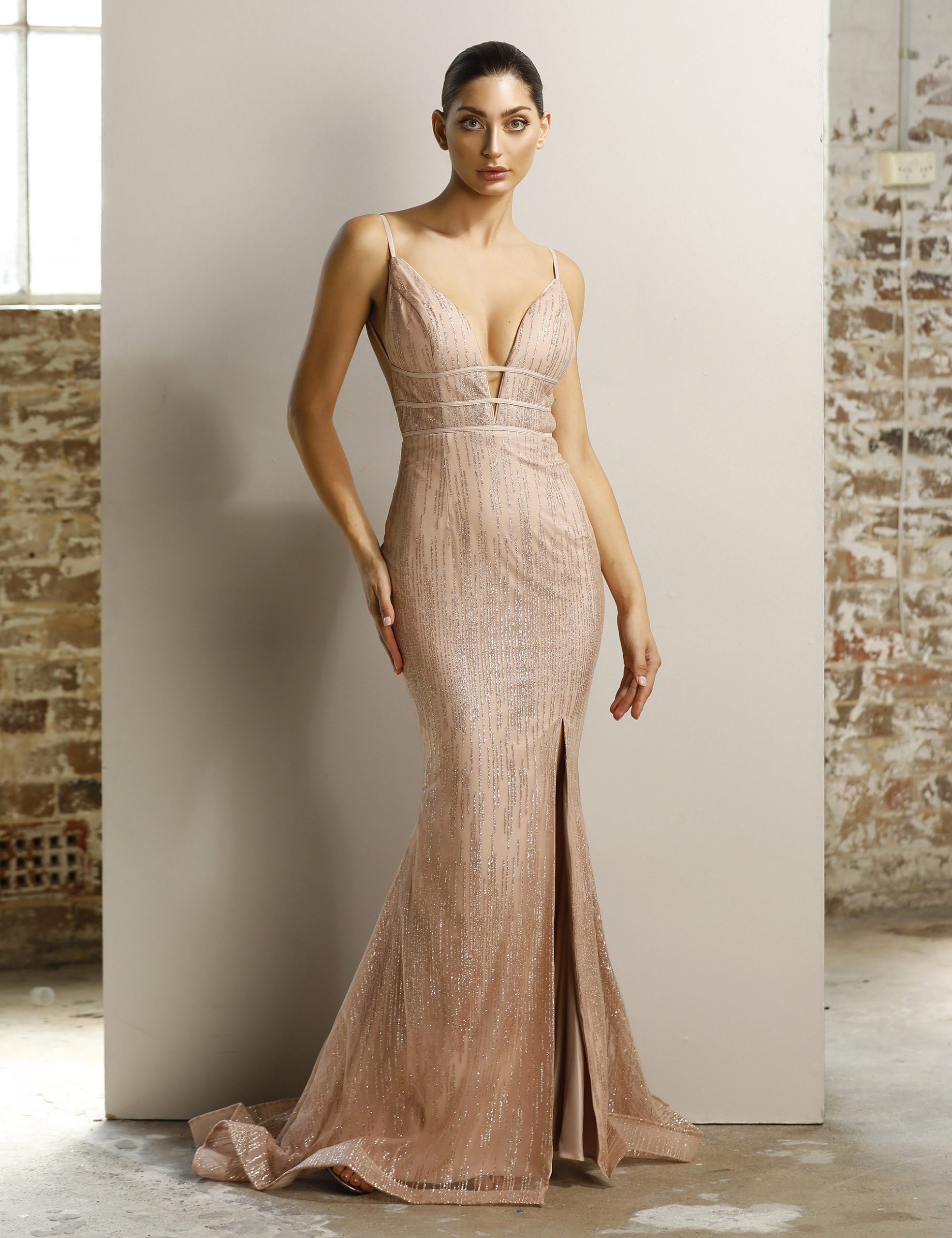 Jadore style JX1124 is an Elegant full length formal gown with plunging V neckline. The low square back is secured with shoestring stap across the back. The gown also features a short train and elegant leg split.