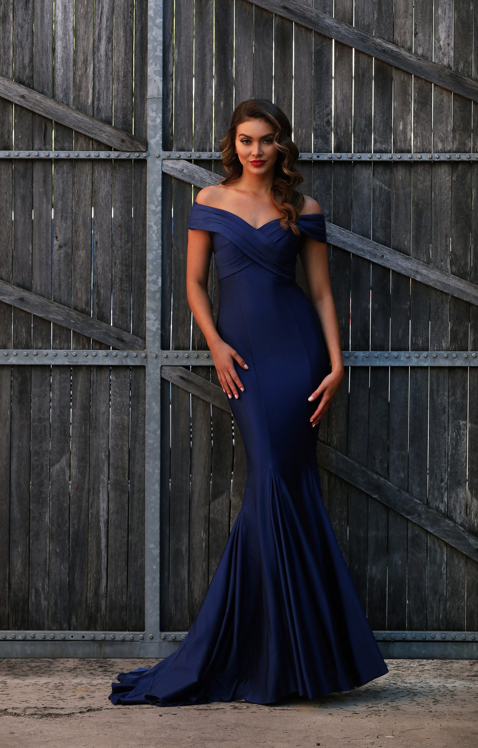 Jadore style JX3020 is an Elegant full length fit & flare formal gown with off the shoulder neckline. The gown also features godets inserted in the seams for extra flare