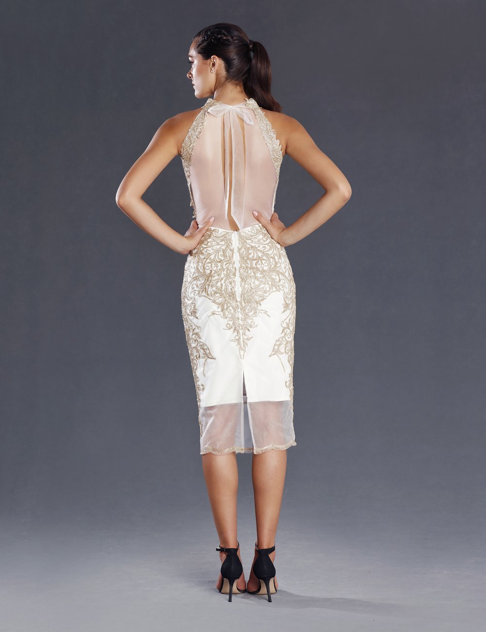 This Striking knee length dress by Jadore would make an excellent fashions on the field outfit or mother of bride/groom outfit. It has striking gold lace, sheer back & high halter neck with a pencil skirt. The fit of this gown is stunning and will turn heads.