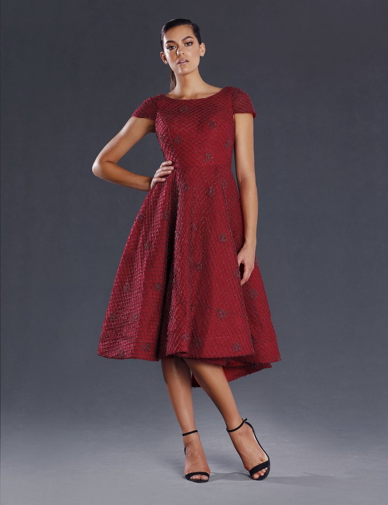 This Striking knee length Party dress, formal dress, fashions on the field outfit or special occasion dress has a high scoop neck, slight cap sleeve, a full circle skirt and unique beading detail. The cinched waist and circle skirt emphasise a small waist. The skirt is lined with a stiffener to ensure it holds the shape (could be made fuller with the addition of a hoop). The fit of this gown is stunning and will turn heads.