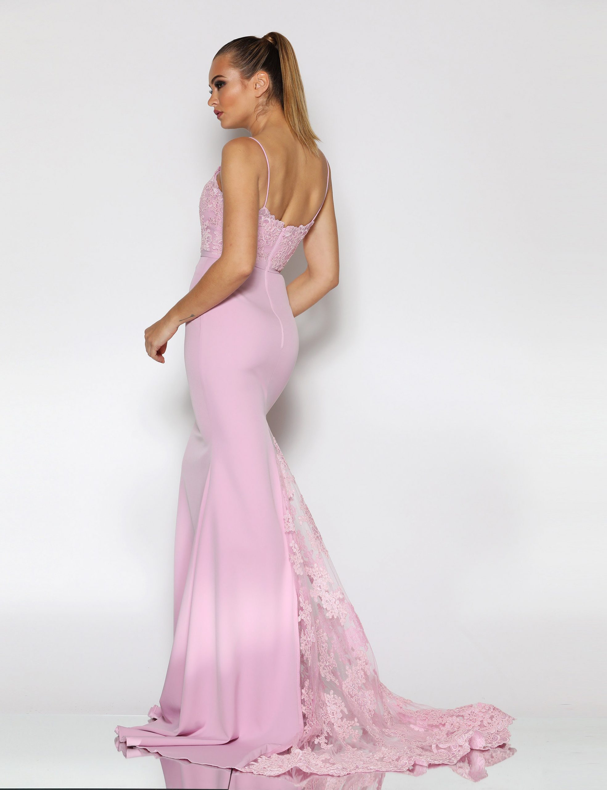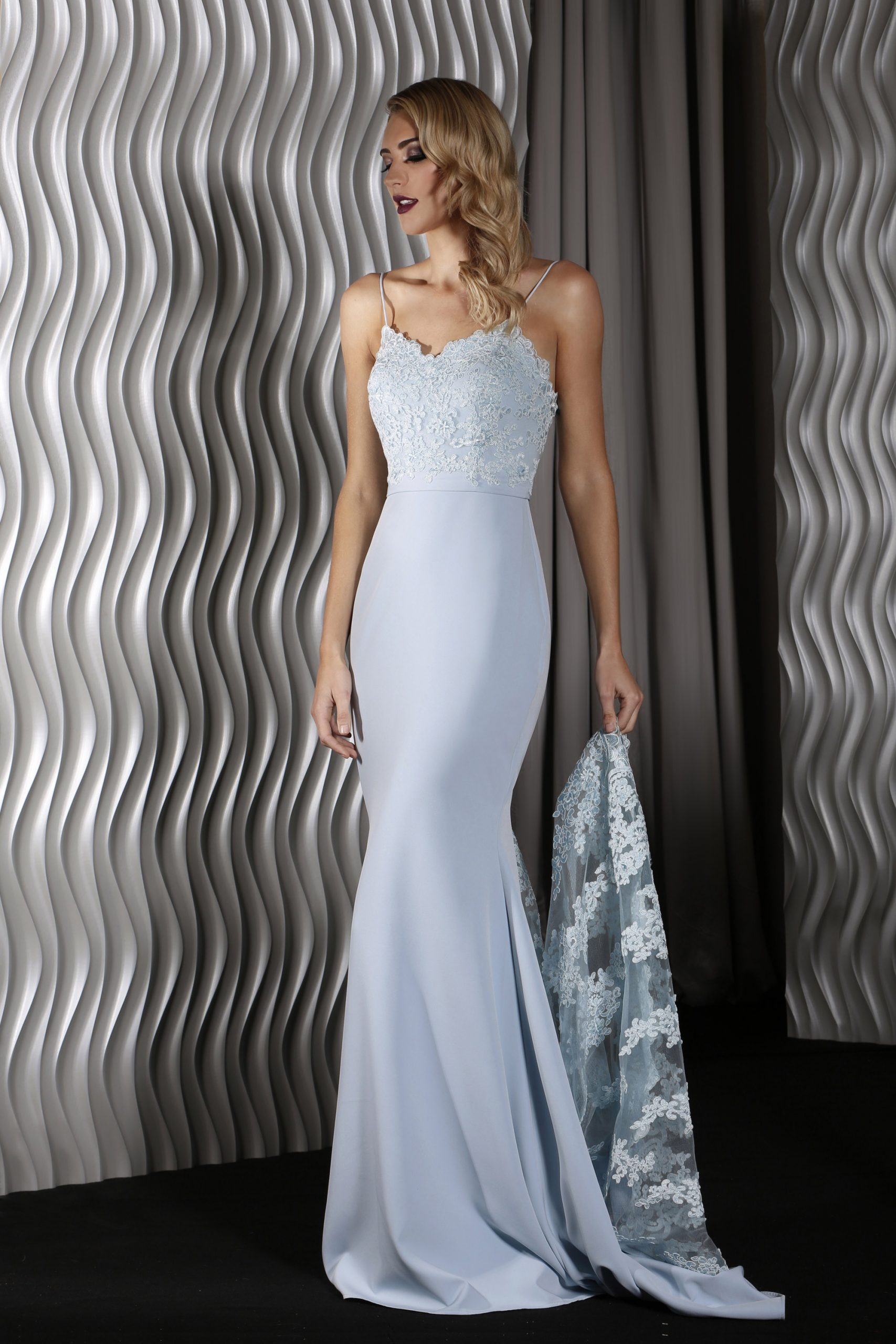 J8034, An elegant full length gown in a luxurious stretch fabric by Jadore. Featuring a sweetheart neckline with shoestring straps. The elegant fit and flare silhouette also features a lace bodice and lace godet inserted into the train.