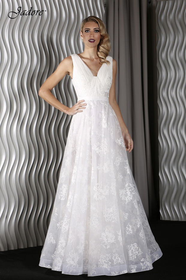 Romantic floral organza, floor length gown with ruching on the bodice from Jadore. Beautiful circle skirt with soft floral detailing make this a very flattering gown. Also features guipure lace on the bodice.