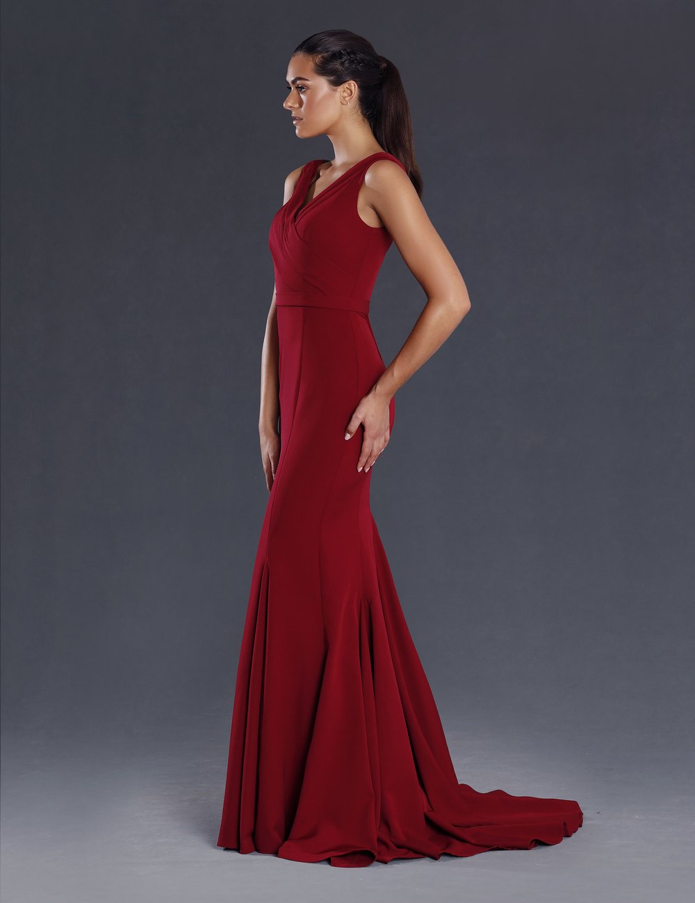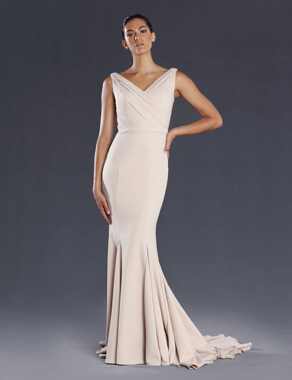 An elegant full length gown in a luxurious stretch fabric by Jadore. Featuring a wide V neckline. The elegant fit and flare silhouette also features godets inserted into the seams for extra flare. This gown is perfect for any special occasion; mother of the bride (or groom), or evening dress for ball or school formal.