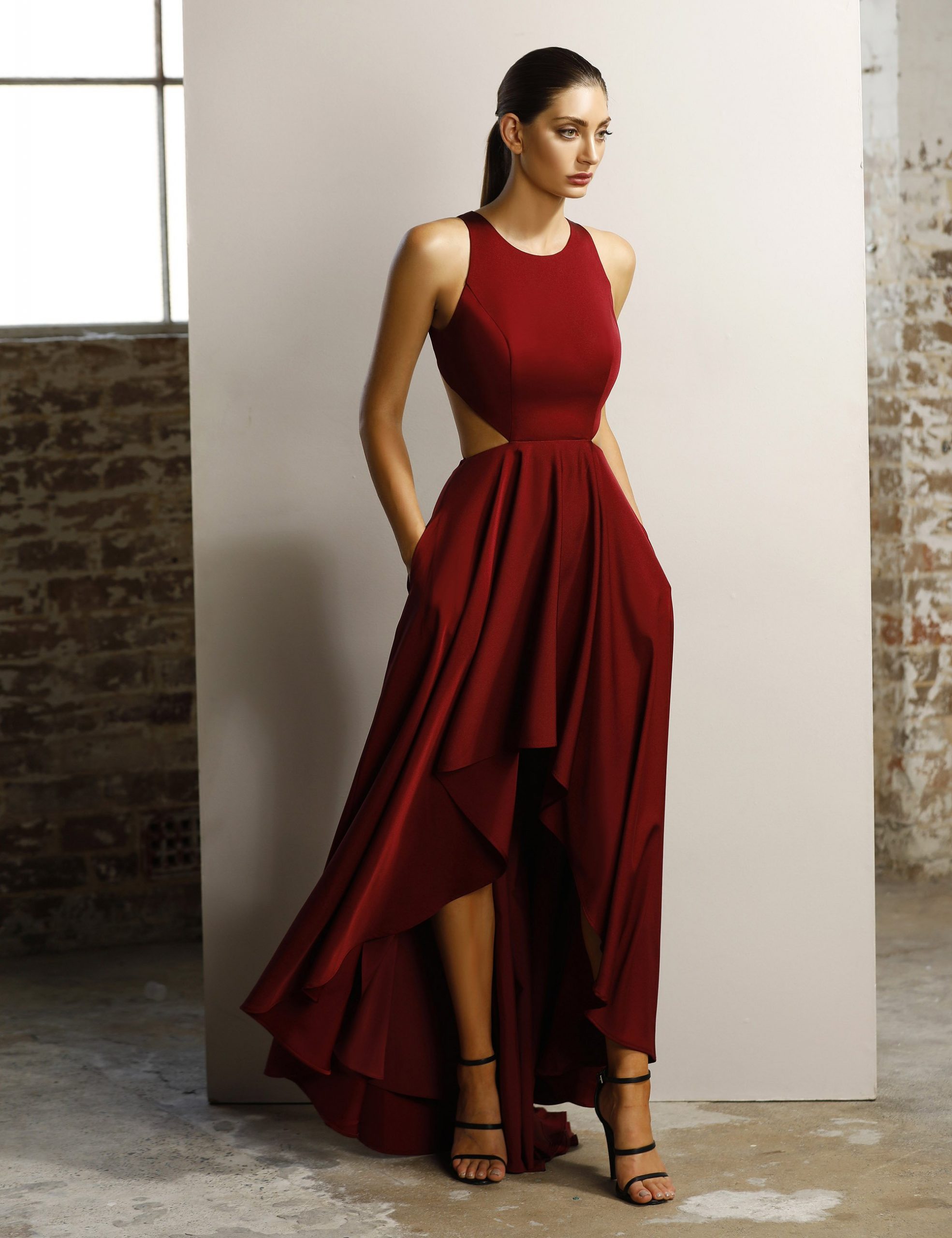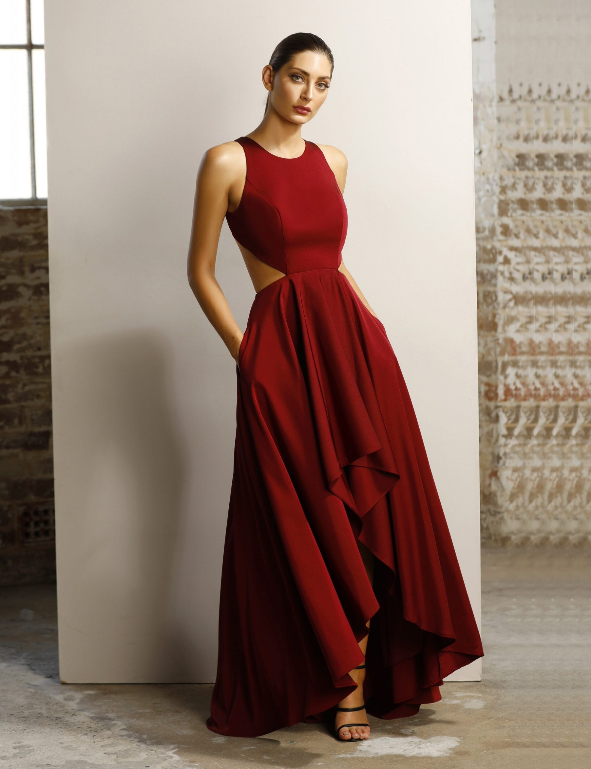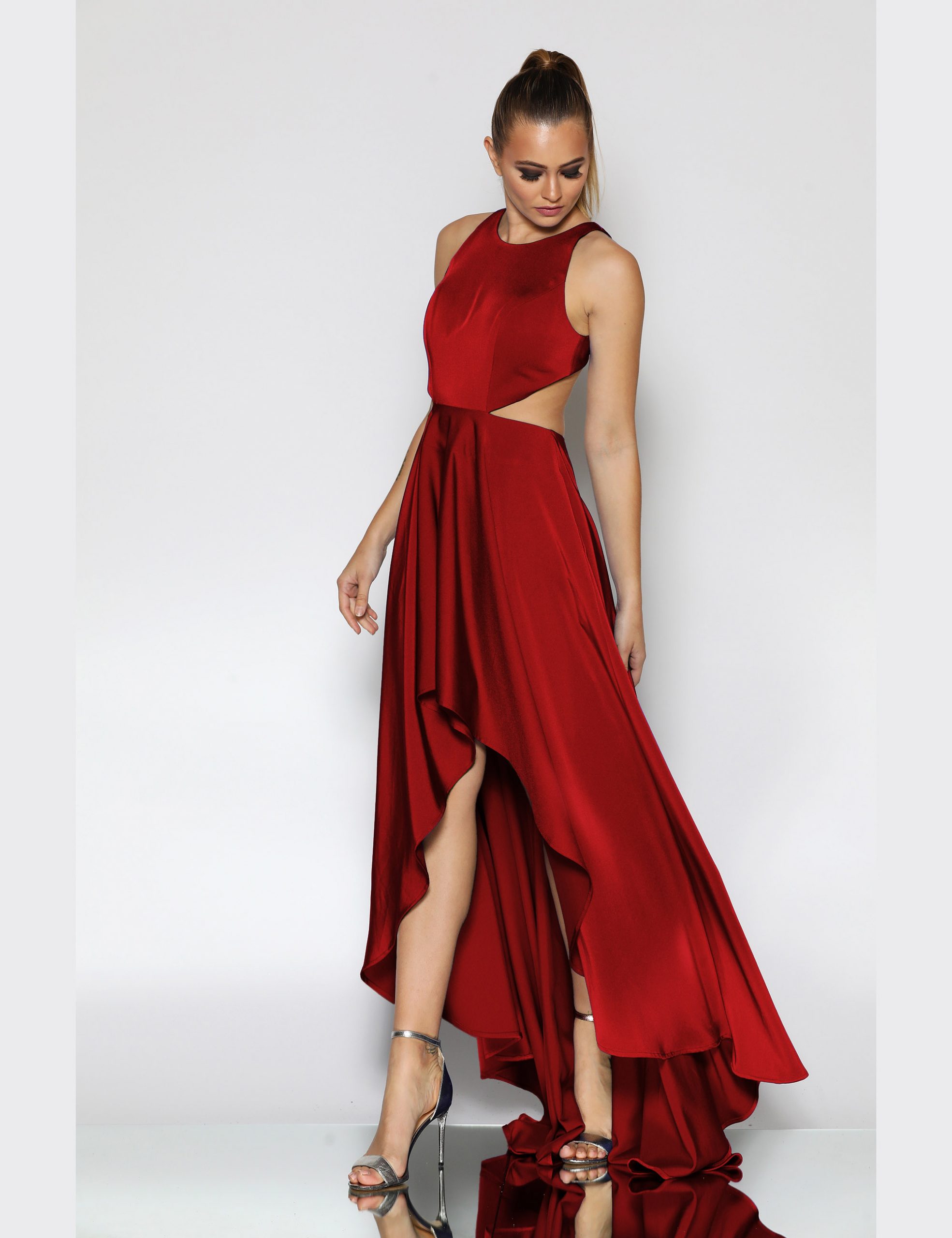 A fun, Hi-lo gown in a luxurious stretch satin by Jadore. Featuring a high neckline and Cut-away shoulders, back and waist.  The gown is fully lined and a contains boning and moulded cups.