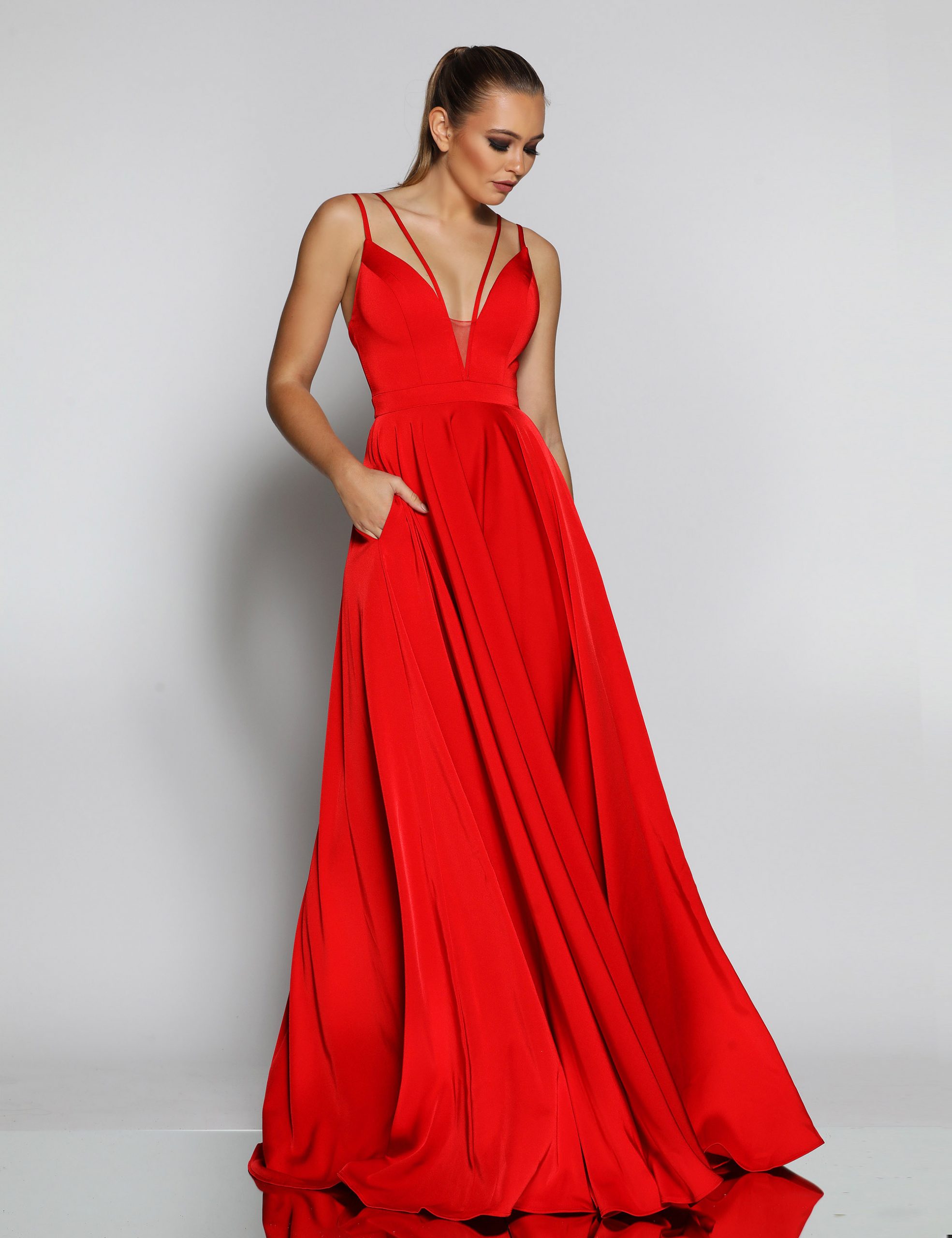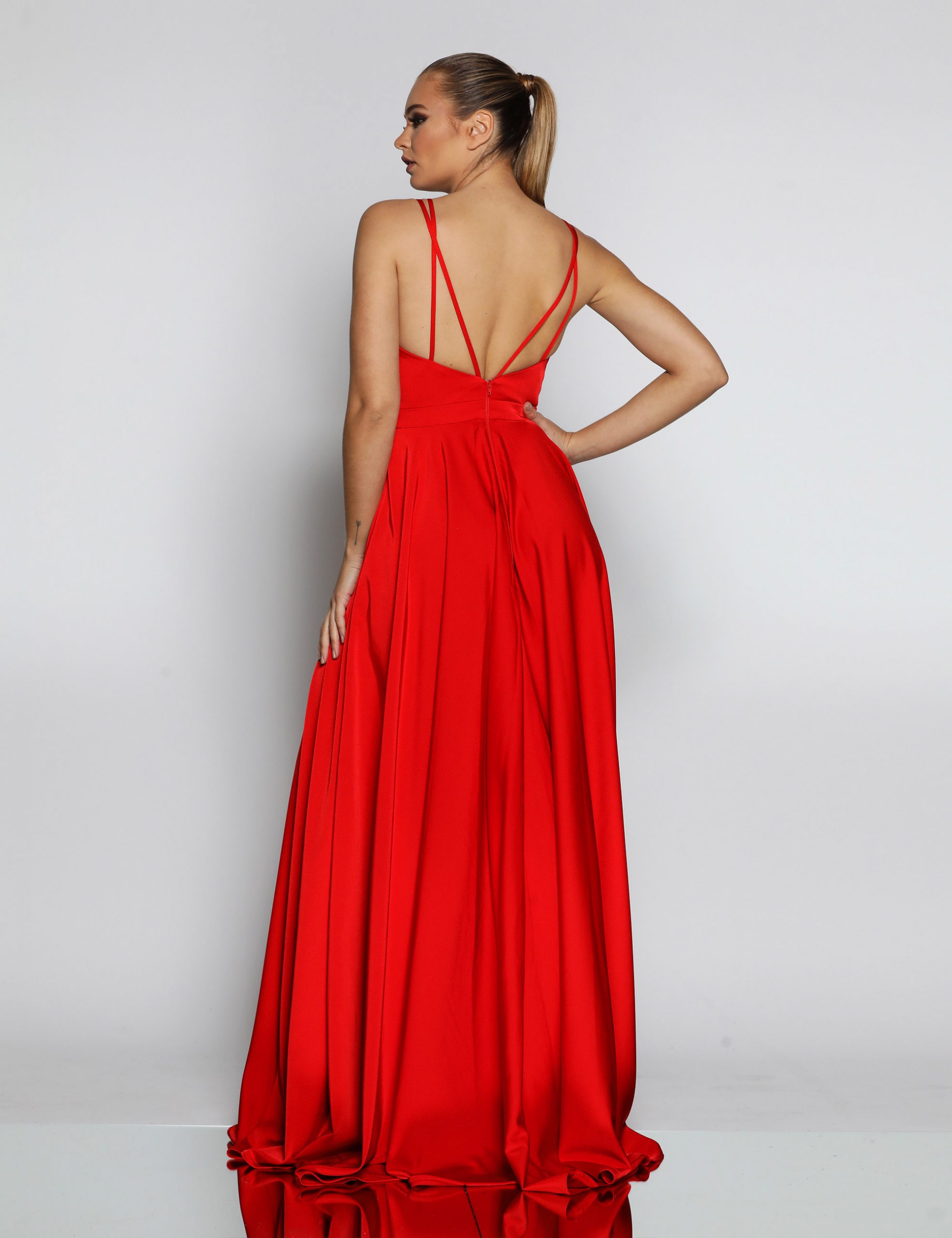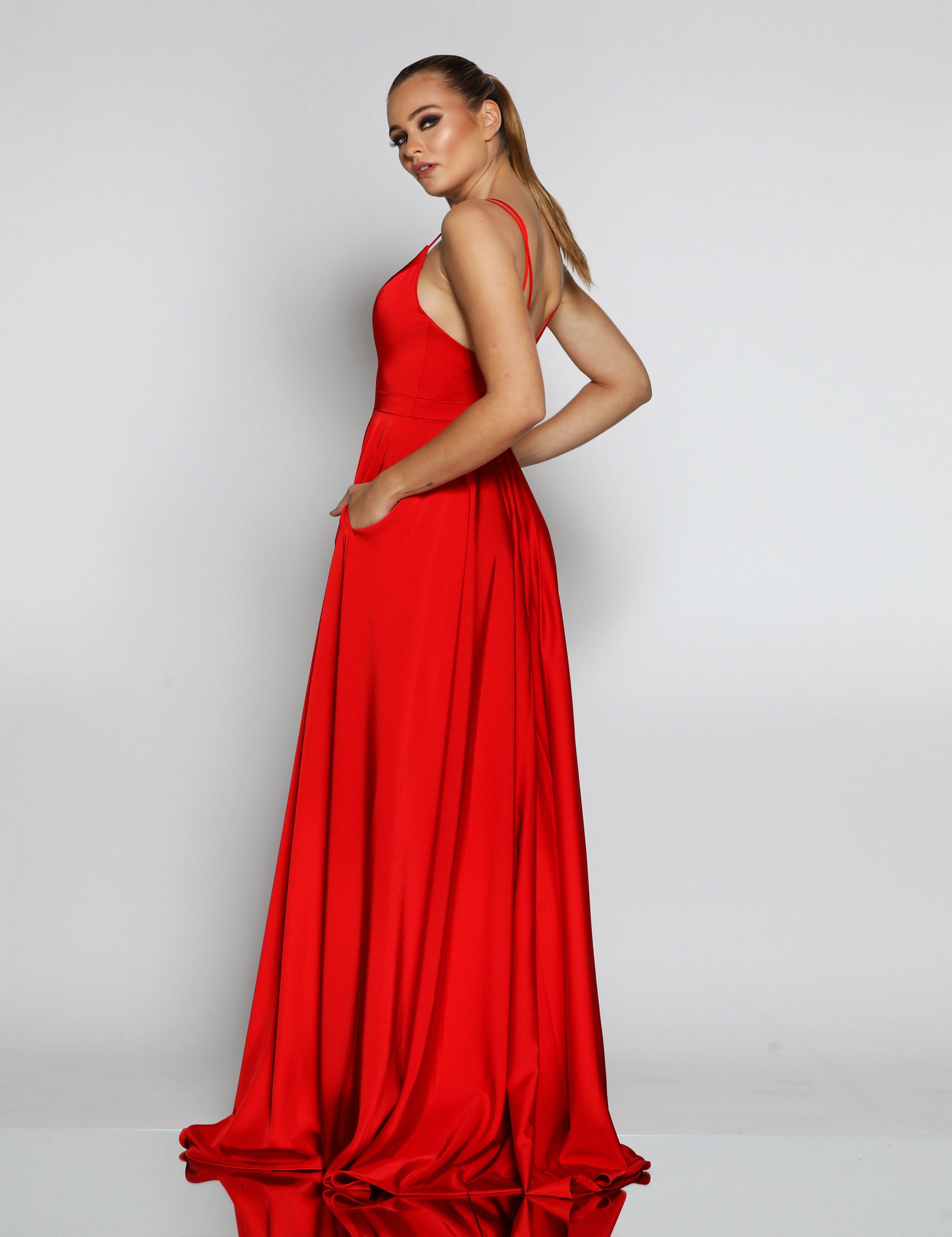Floor length V neck ball gown from Jadore.  Stunning Red colour featuring a fitted V neck bodice with double shoe string straps (the second coming from the deep v), lowish back & full circle skirt. HAS POCKETS!!! Perfect for your next formal occasion.