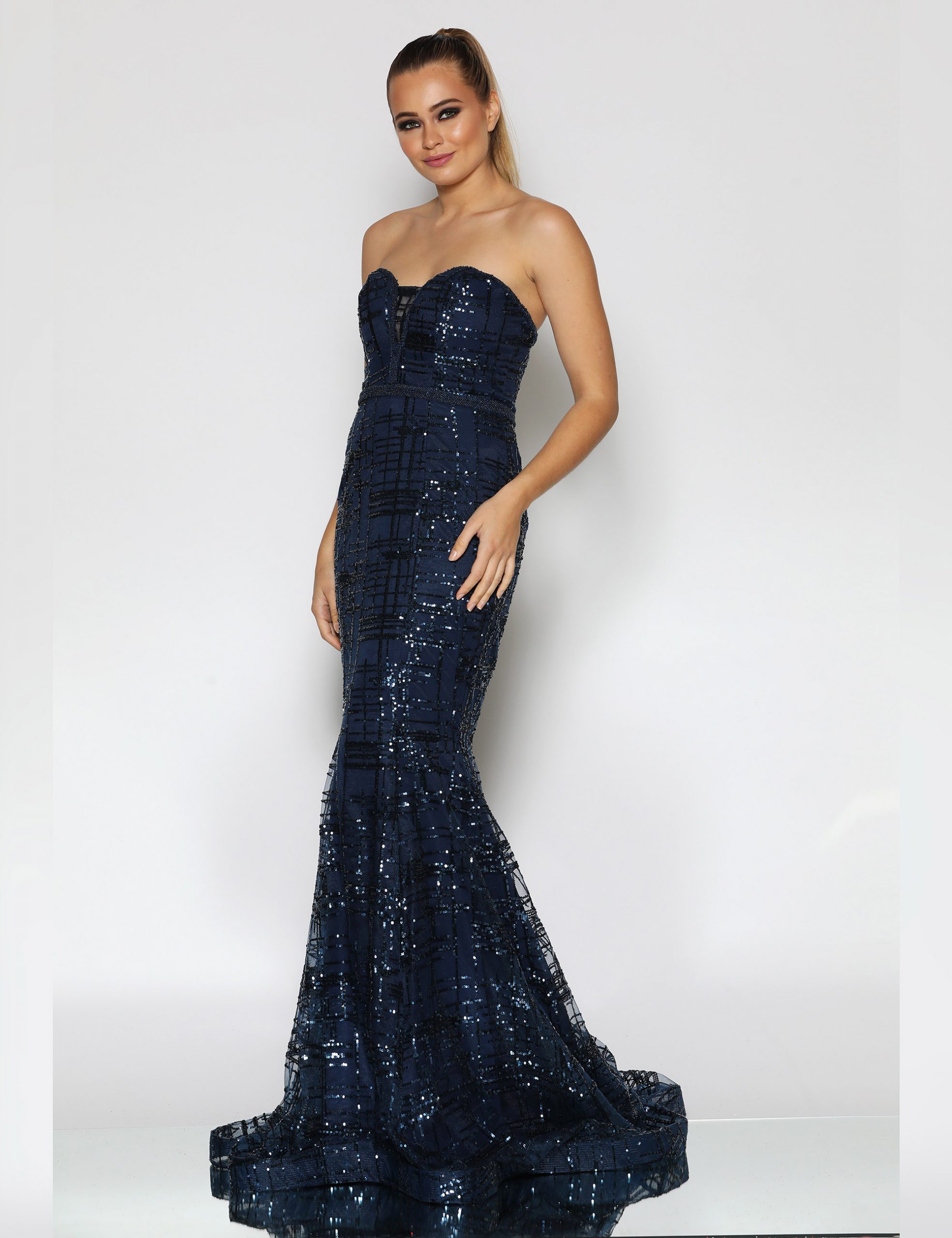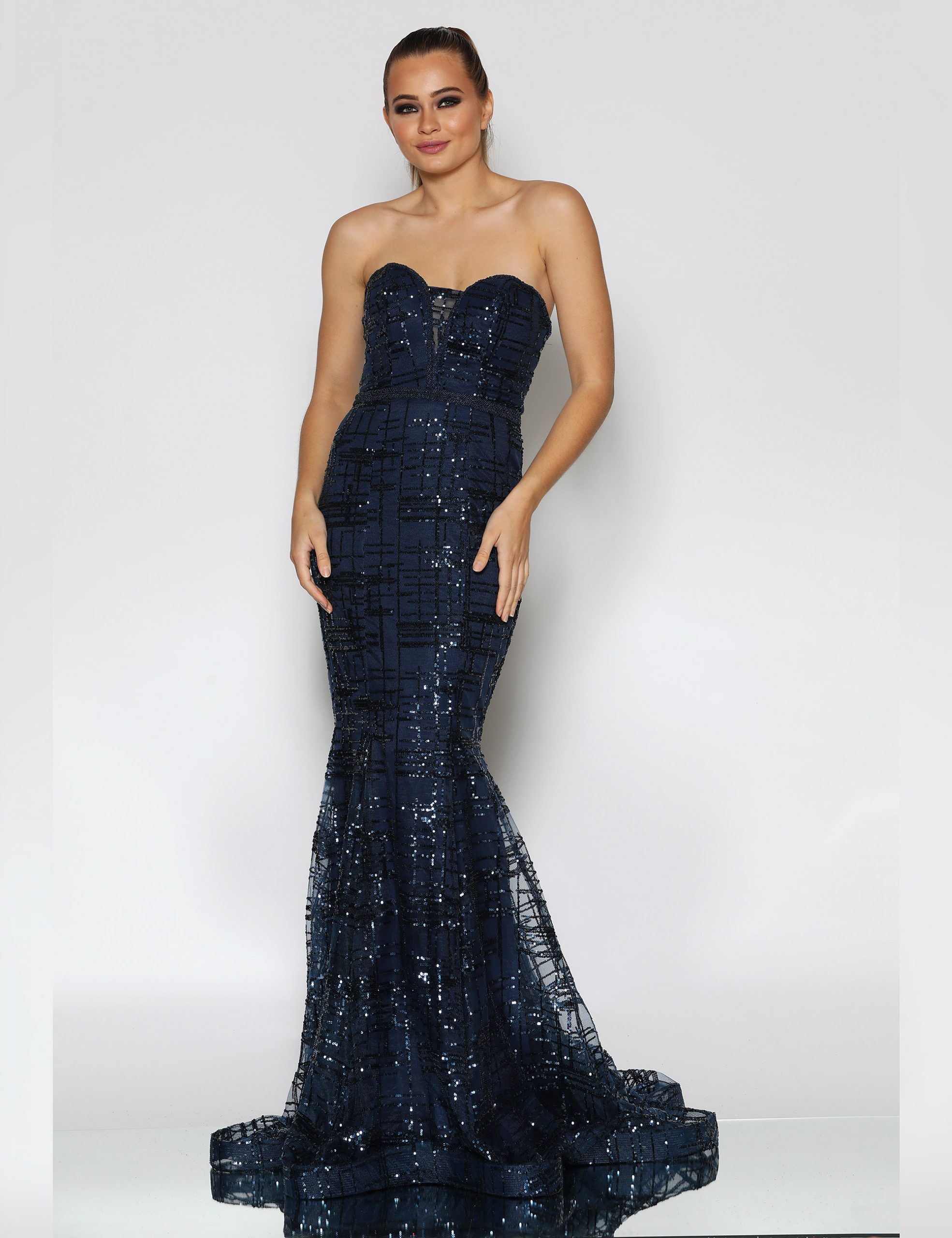 Floor length strapless gown from Jadore. Fit & Flare gown features fitted bodice & stiffener in the hem of the fit & flare skirt. Features delicate sequins. Perfect for your ball or formal occasion.
