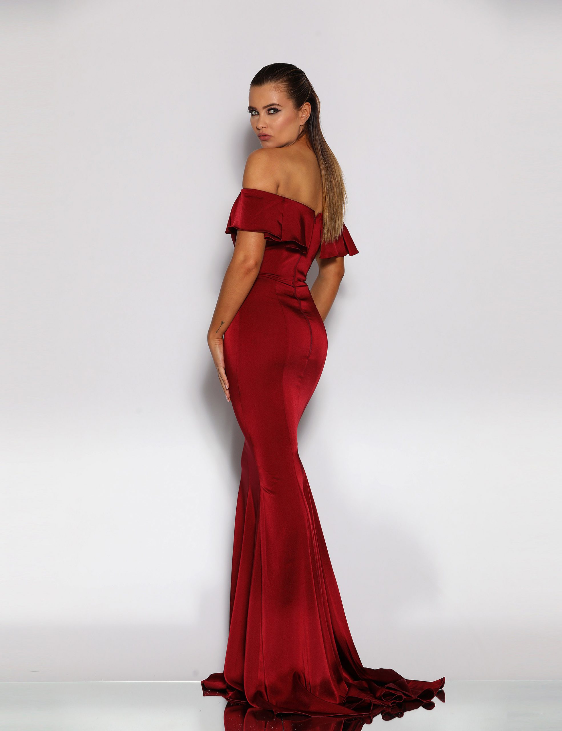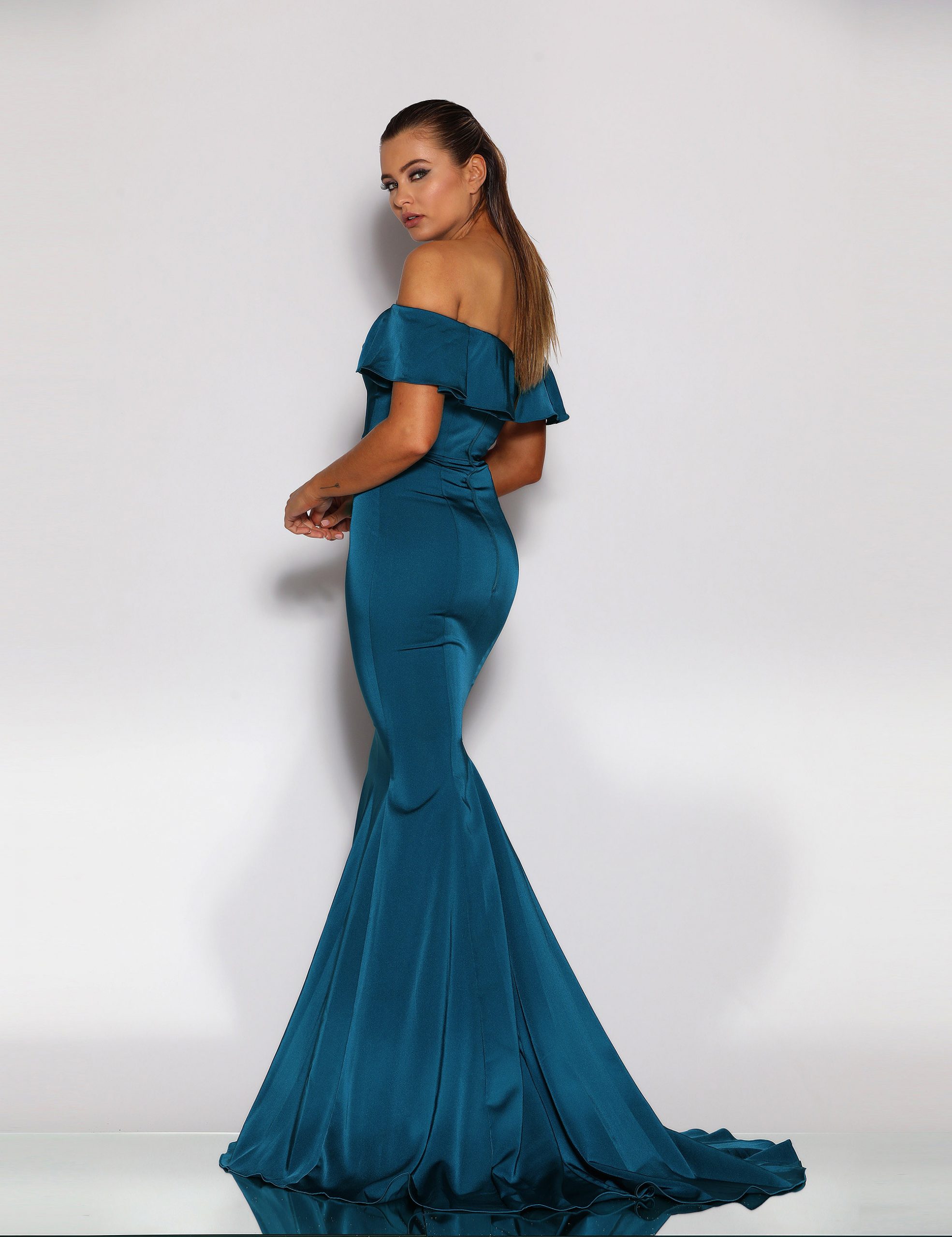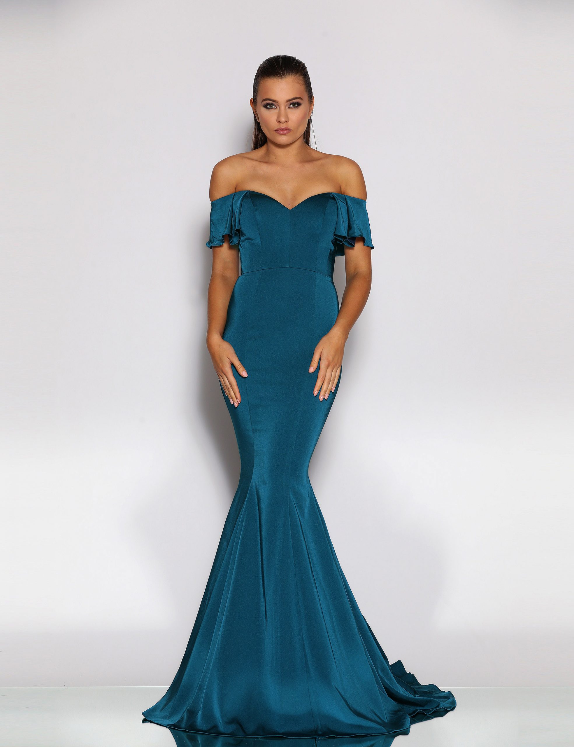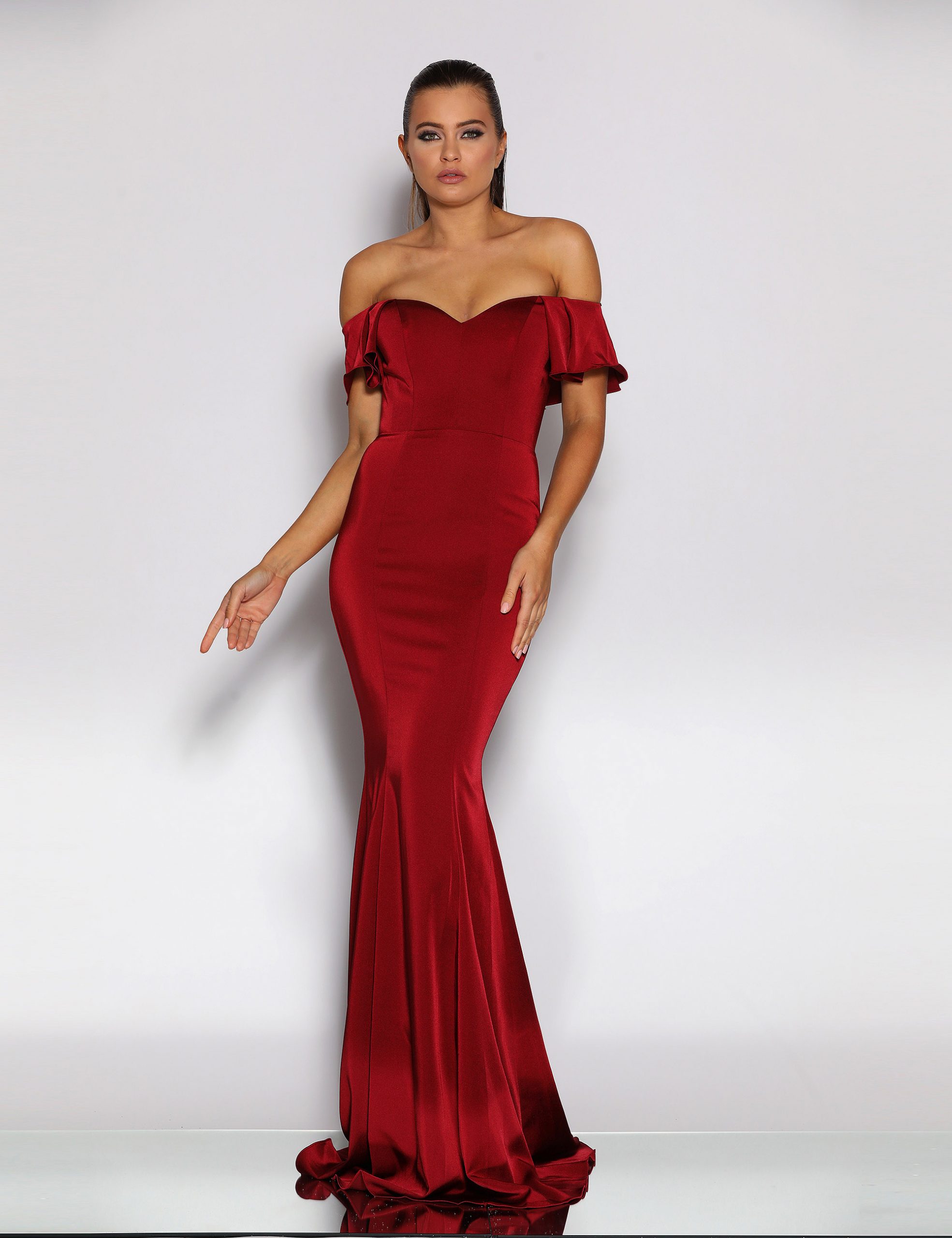An elegant full length gown in a luxurious stretch suiting by Jadore. Featuring a sweetheart neckline, off-the-shoulder sleeve and narrow waistband. The elegant fit and flare silhouette also features a short train. The gown is fully lined and a contains boning and moulded cups.