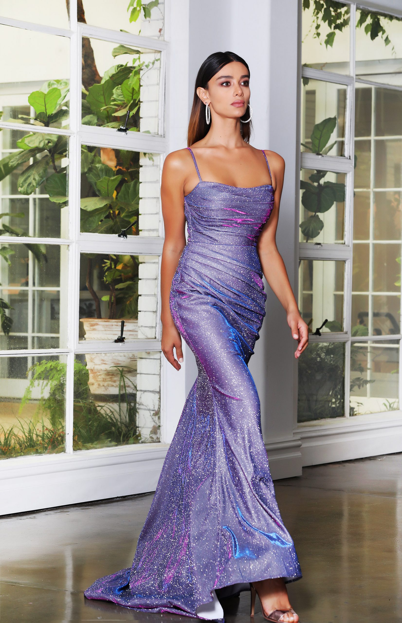 JX4010, An elegant, full length, fishtail gown featuring a scooped neckline, trumpet silhouette and plunging back by Jadore. This dress is fully lined, with a padded bust and center back zip. The elegant fit and flare silhouette is made from a glitter jersey.
