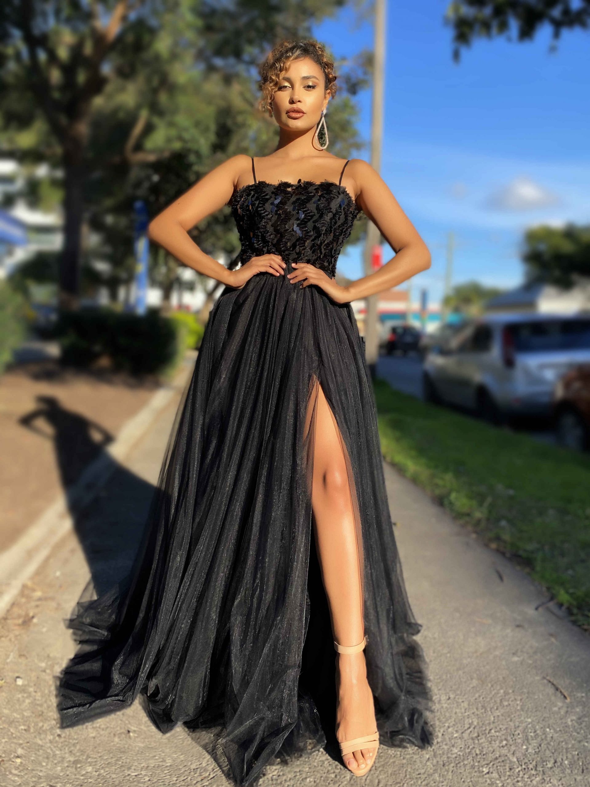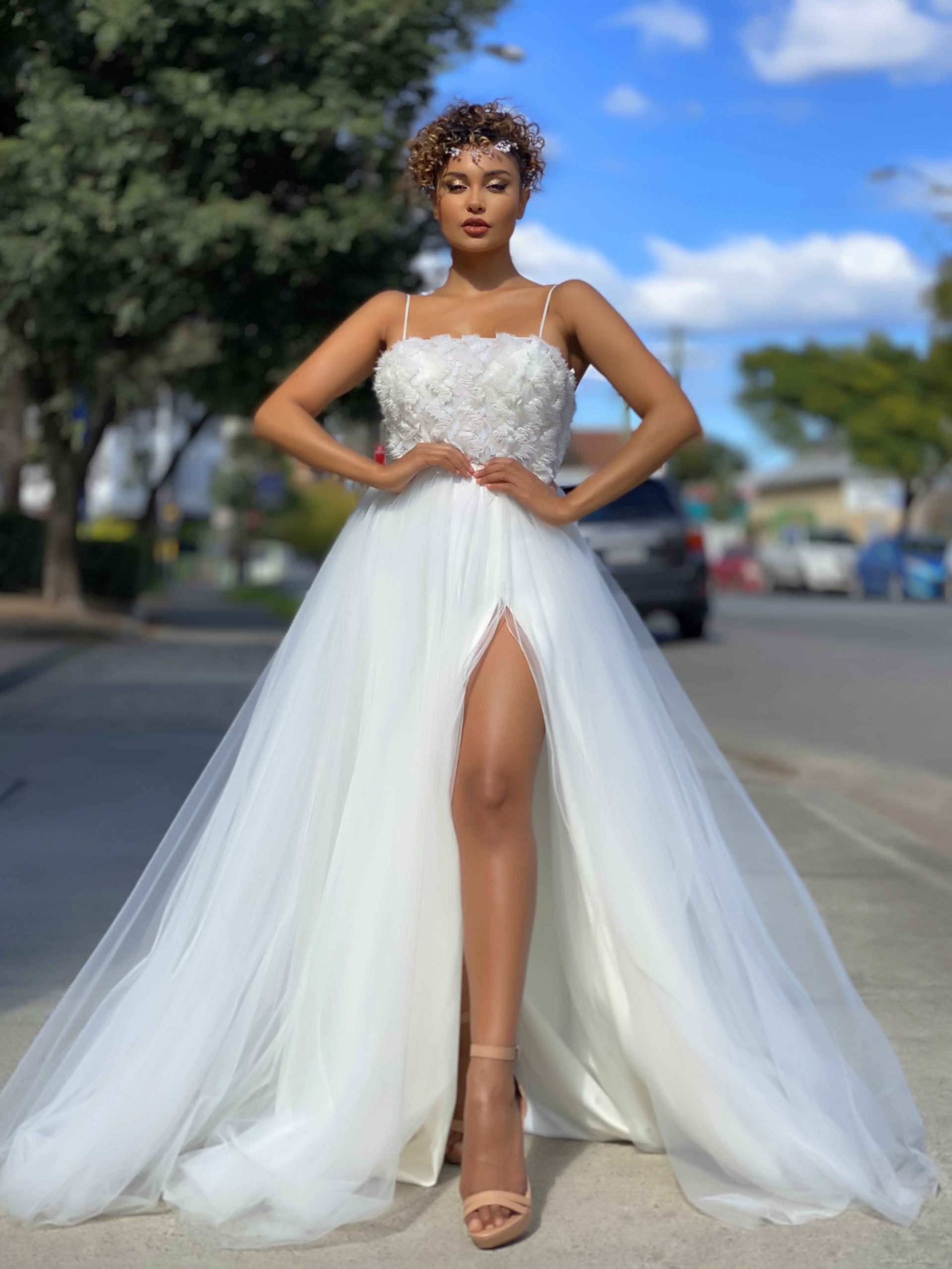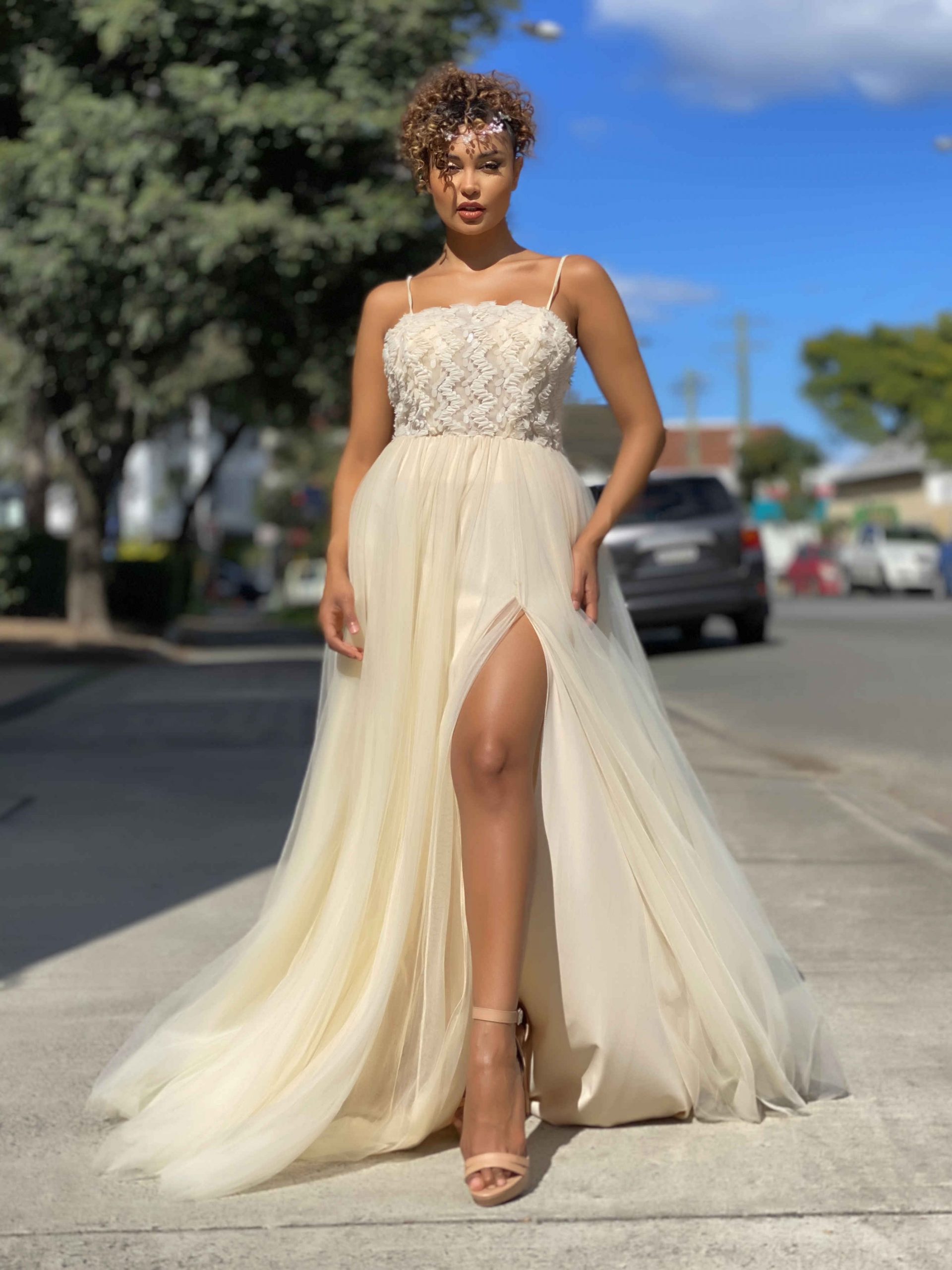 This bridal/formal gown, JX4057, by Jadore is floor-length and features a tulle skirt with delicate tulle overlay and thigh high split. The fitted bodice is complemented with a fuller tulle skirt. The bodice features a chiffon & bead embellishment.