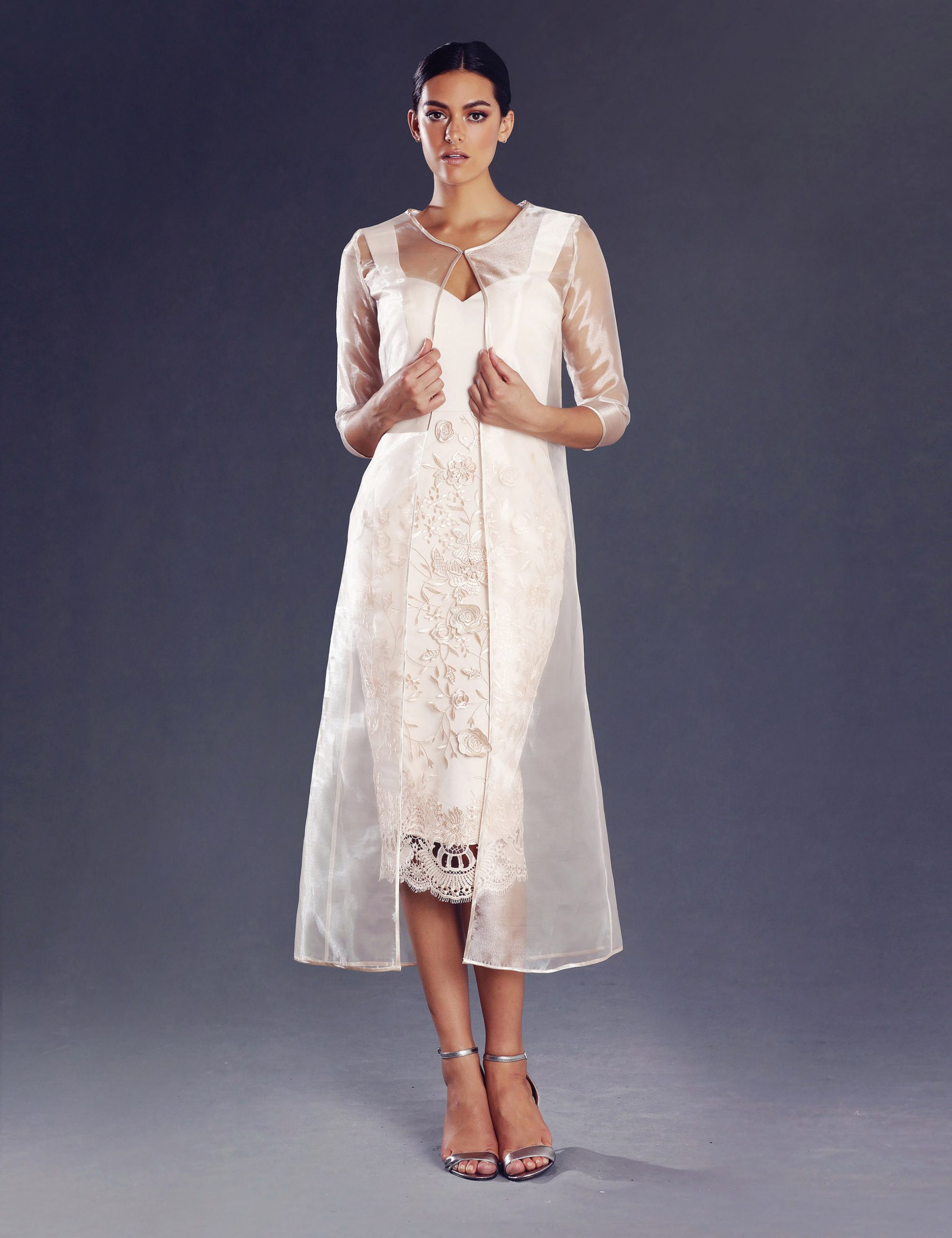 This elegant knee length dress by Jadore would make an excellent mother of bride/groom outfit or fashions on the field outfit. The floral embroidered tulle fitted dress features a pencil skirt, fitted plain bodice and a matching 3/4 sleeve sheer organza coat. The fit of this gown is stunning and will turn heads.