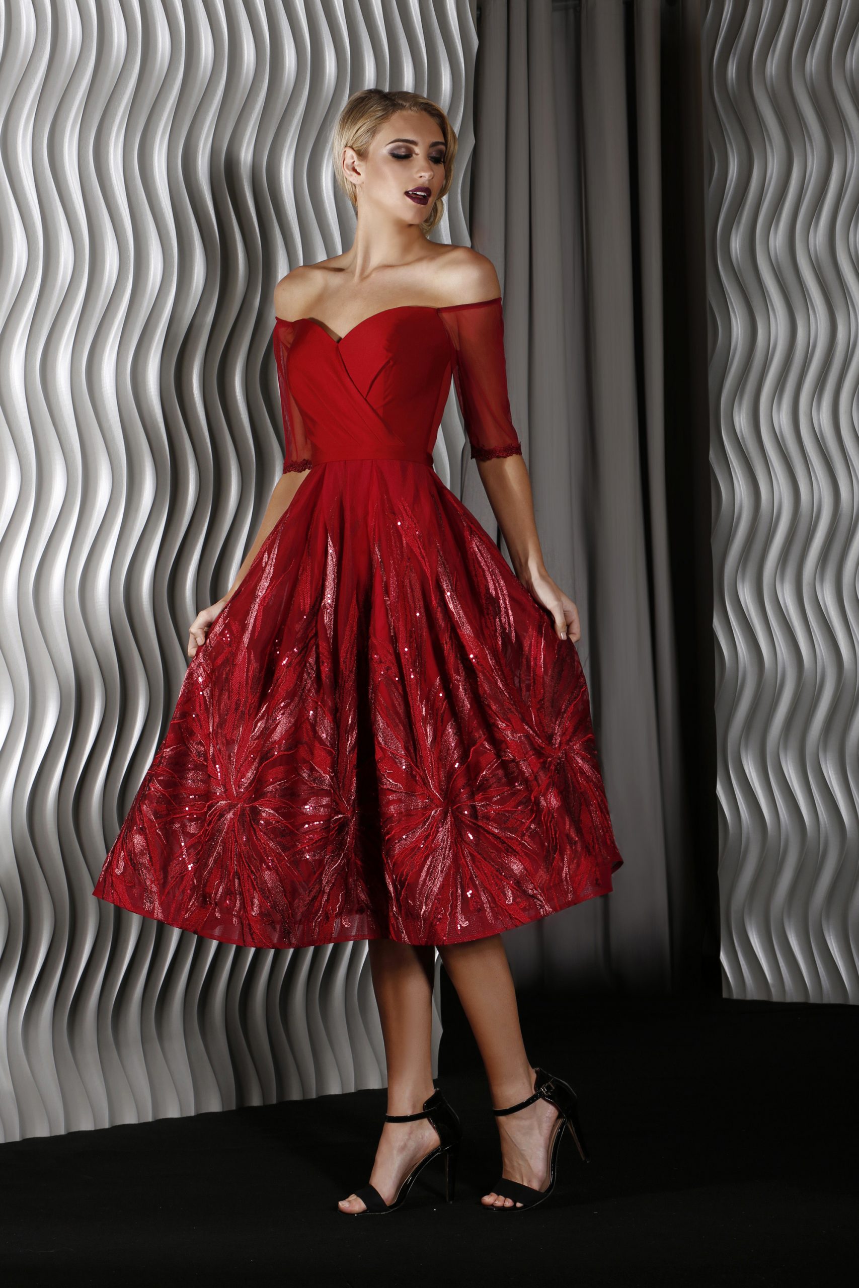 This Striking knee length Party dress, formal dress, fashions on the field outfit or special occasion dress, J9033, has a sweetheart neckline featuring sheer ¾ length sleeves and a patterned skirt. The off-the-shoulder neckline is stunning and elegant.