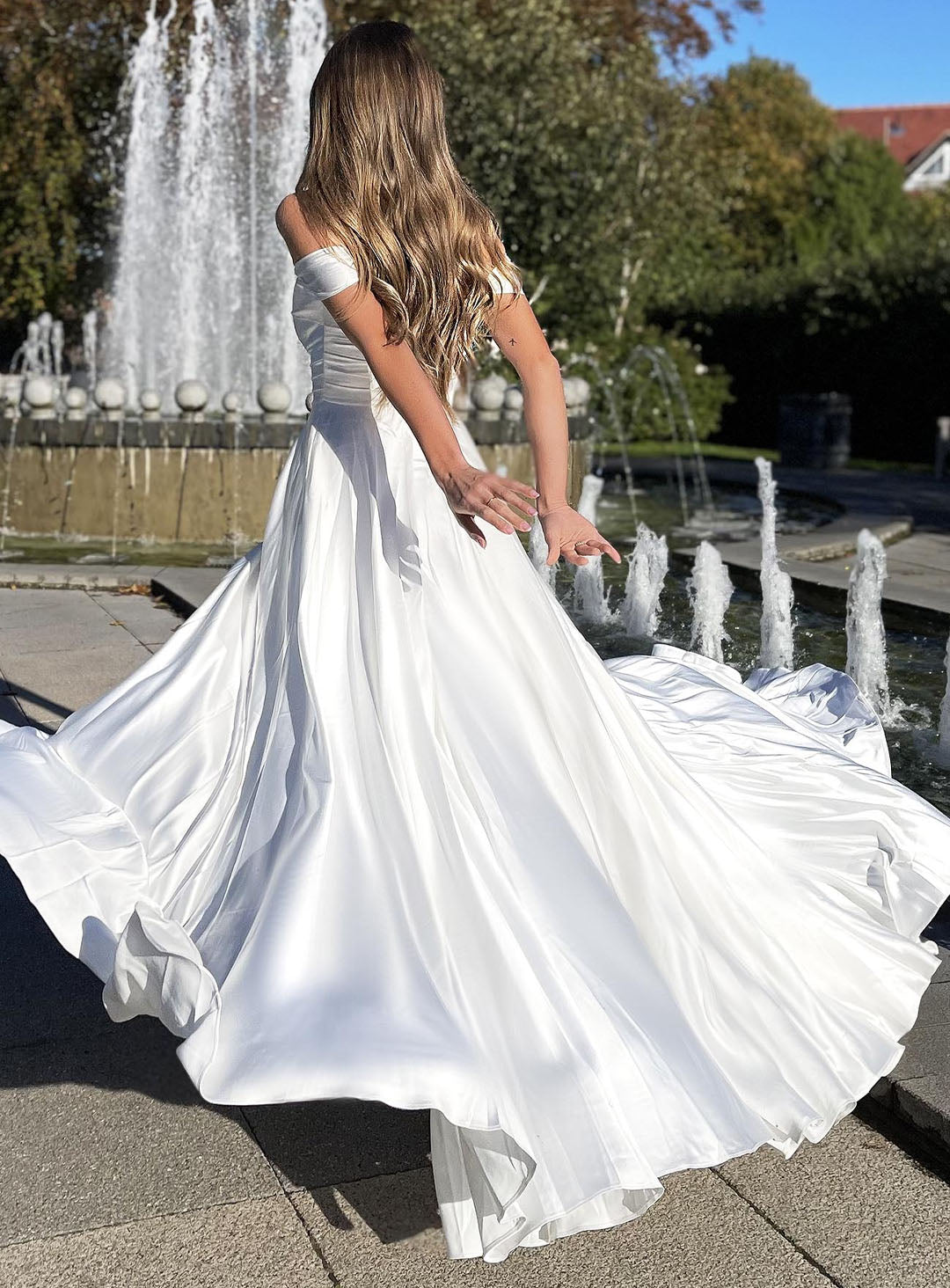 Designs range from flowing A-line silhouettes to sleek satin dresses, catering to both classic and contemporary tastes.