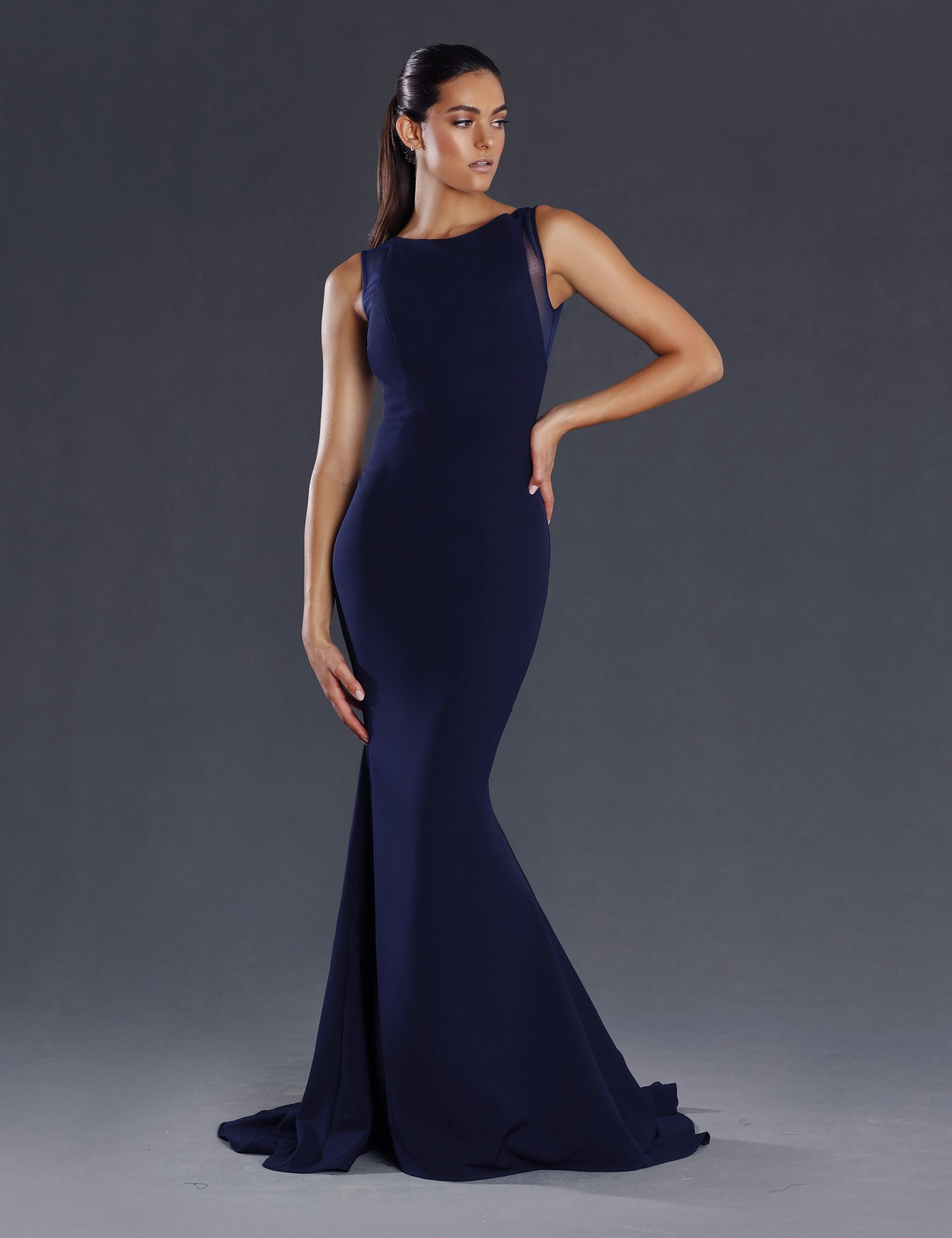 Elegant fitted, floor length Jadore gown.  This gown features a high neck and Keyhole back. Fully lined with bust cups and center back zip.