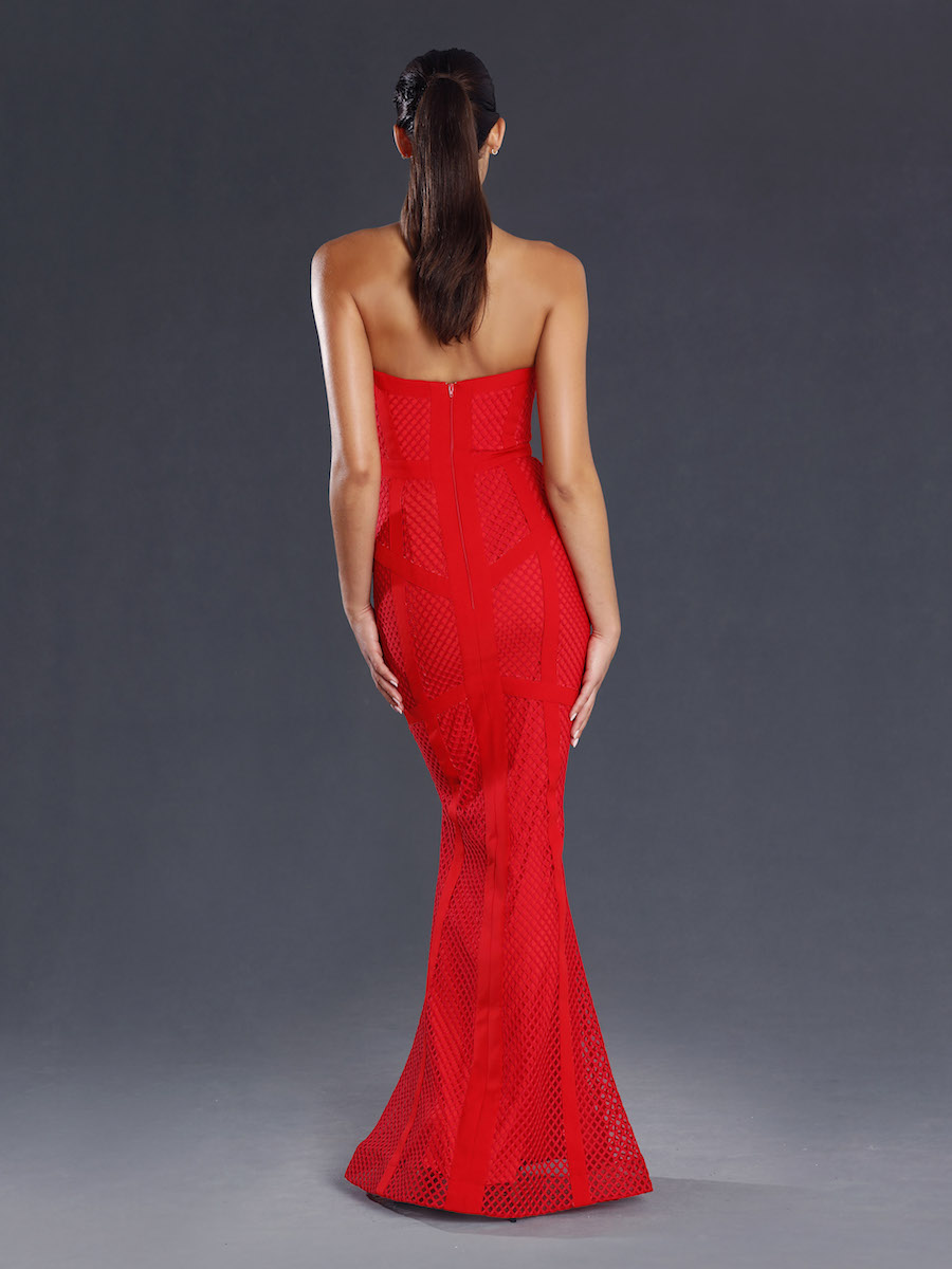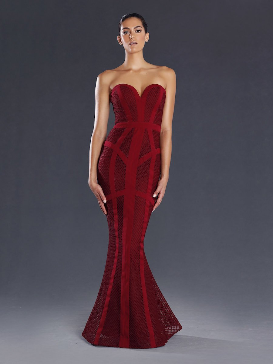 An elegant full length gown in a large mesh-like fabric by Jadore. Featuring a sweetheart neckline. The elegant fit and flare silhouette also features panelling for an extra slimming effect. This gown is perfect for any special occasion; mother of the bride (or groom), or evening dress for ball or school formal.
